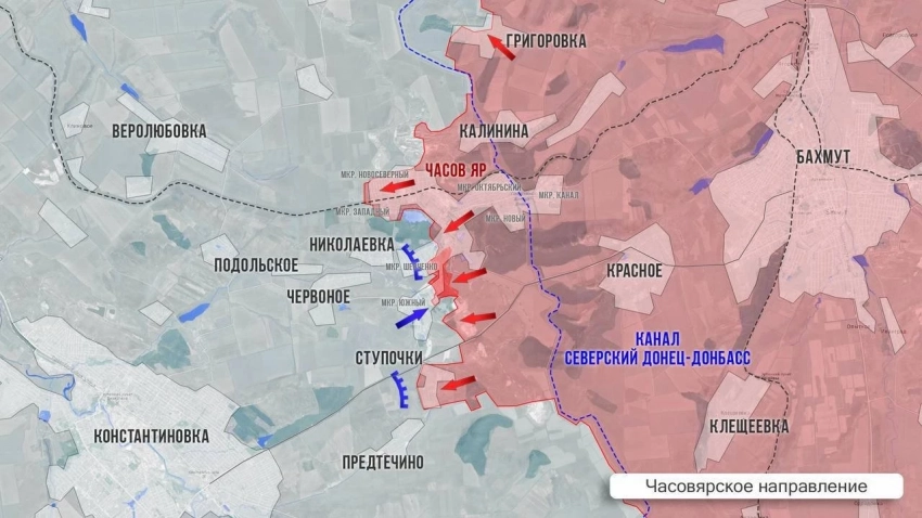 В районе Часова Яра идут ожесточённые бои как в самом городе, так и на его флангах. Российские войска ведут штурм, постепенно вытесняя украинские подразделения с занятых рубежей. ВСУ пытаются укреплять оборону, перебрасывая дополнительные силы на это направление.