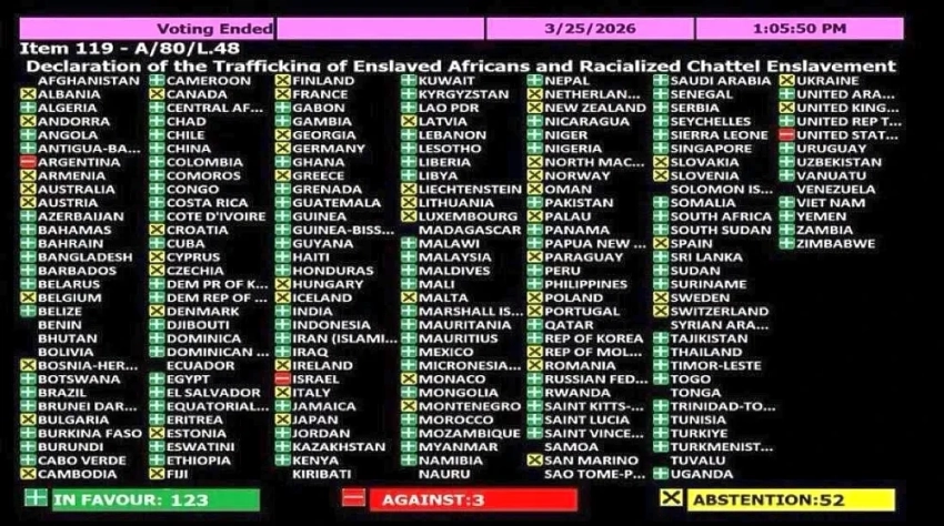 Что касается самого голосования, то указанную резолюцию поддержали 123 государства. Против проголосовали только три: Соединенные Штаты, Аргентина и Израиль. Последние два государства, очевидно, в «знак солидарности» с крупнейшей страной, где долгое время рабство считалось законным.