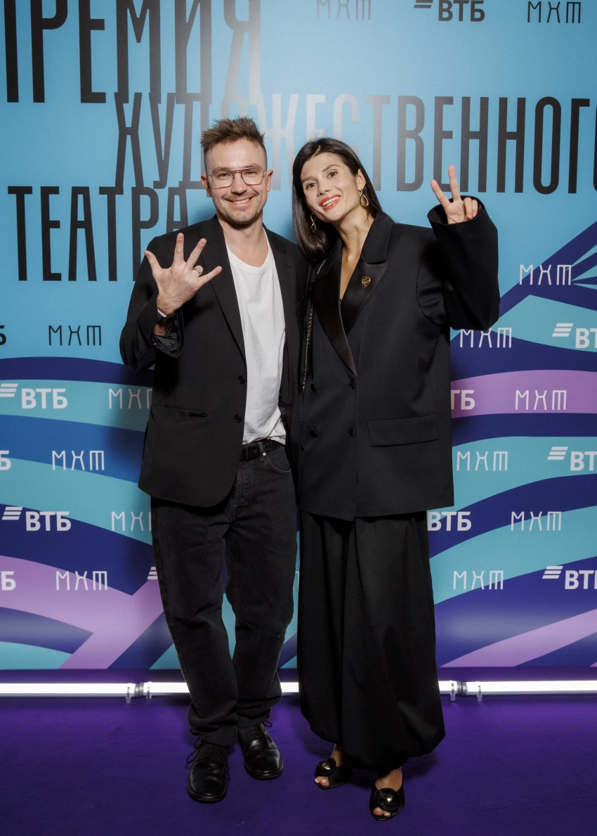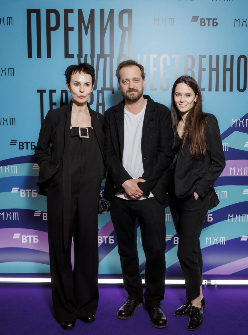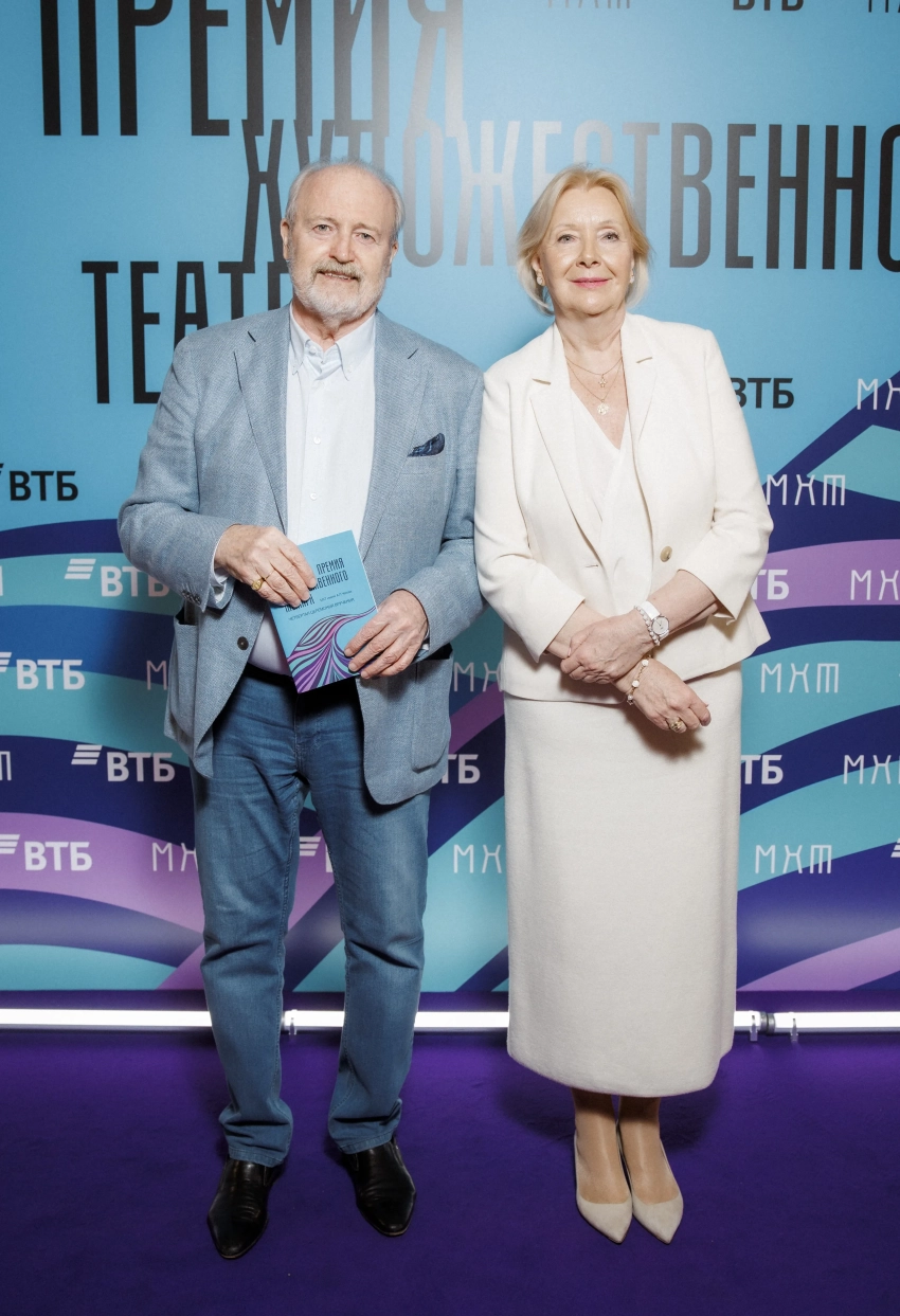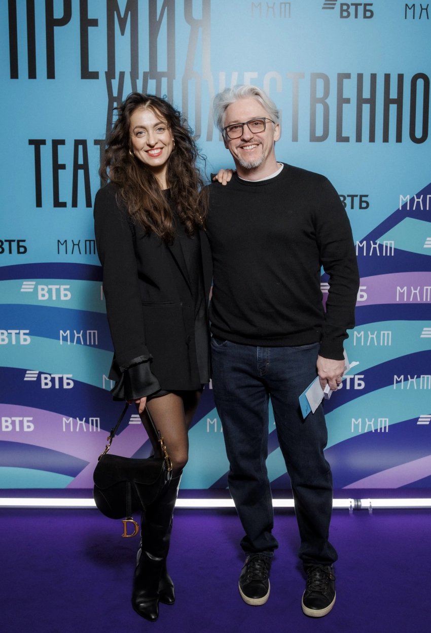 Владимир Хотиненко с женойПремия Художественного театра присуждается молодым деятелям искусств до 35 лет включительно, заявившим о себе в минувшем году. Центральной темой церемонии в этом году стала тема наставников — людей, раскрывающих и направляющих талант молодых дарований.